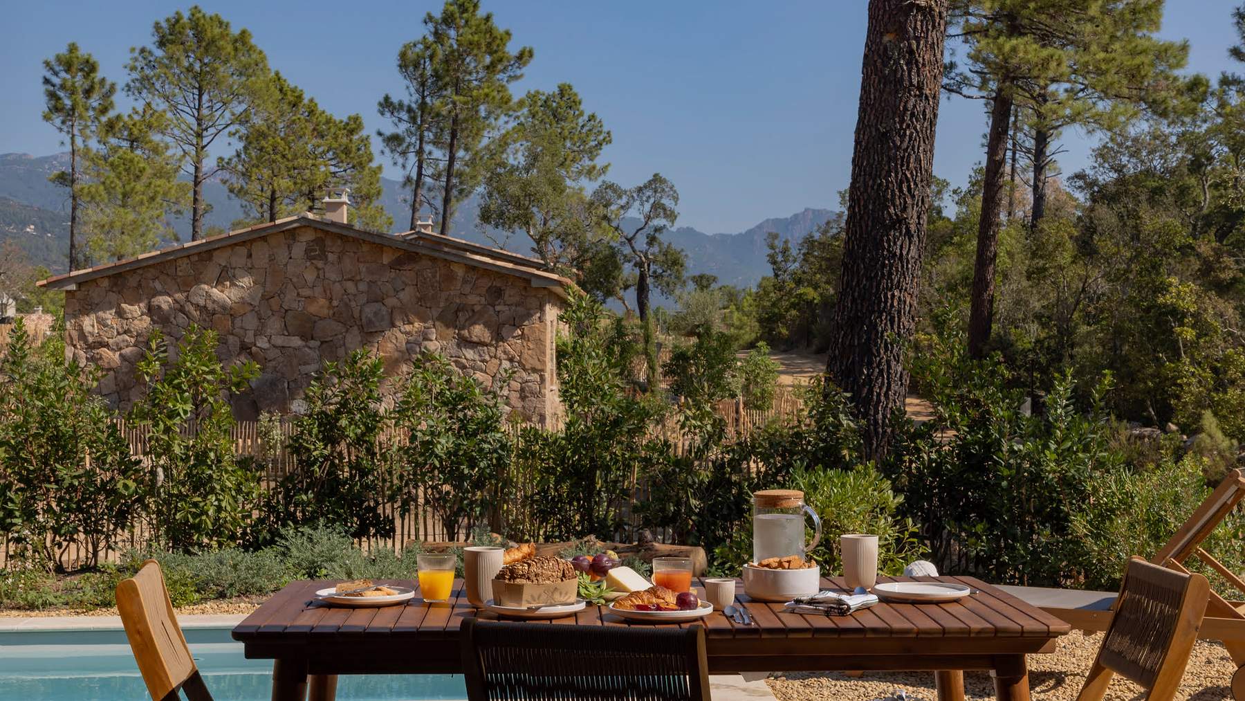 Douceur d’une journée d’été, ciel sans nuage, un verre de tisane énergisante. Atmosphère paisible et délicatement parfumée. Se réjouir d’un lendemain grandiose. Où l’on parcourra la nature éblouissante de l’arrière-pays de Porto-Vecchio, où l’on crapahutera dans les forêts de pins, à pied ou à vélo.